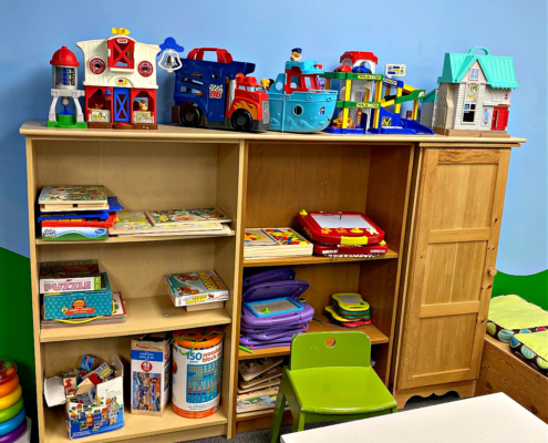 The OUT room features a number of play areas that include a wide variety of hands-on activities, toys, and play stations sized for ages 2 to 7. Please remember to be courteous to the next users and return all items to the shelves after use.