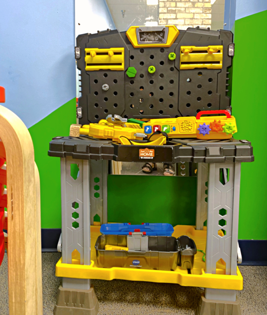 The OUT room features a number of play areas that include a wide variety of hands-on activities, toys, and play stations sized for ages 2 to 7. Please remember to be courteous to the next users and return all items to the shelves after use.