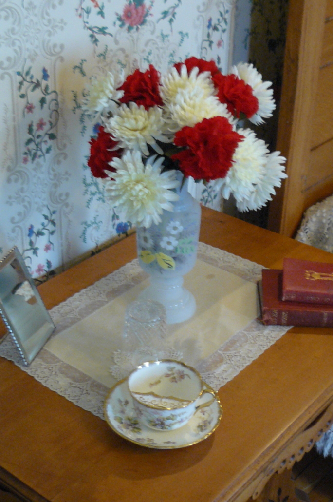 “For some reason I think the moustache cup in the bedroom is very interesting. I always check to make sure it is safe and sound. Having a moustache myself, I like the whole idea. In the Victorian Era, it was stylish for men to wax their moustaches to keep them kempt and tidy. Unfortunately, the heat from the tea would melt this wax and it would fall into their teacups. This would not be appetizing to drink, so the moustache cup was created. The special lip protects a man’s moustache, so he could safely enjoy his tea without the unpleasant wax.”