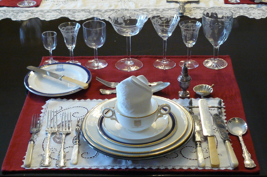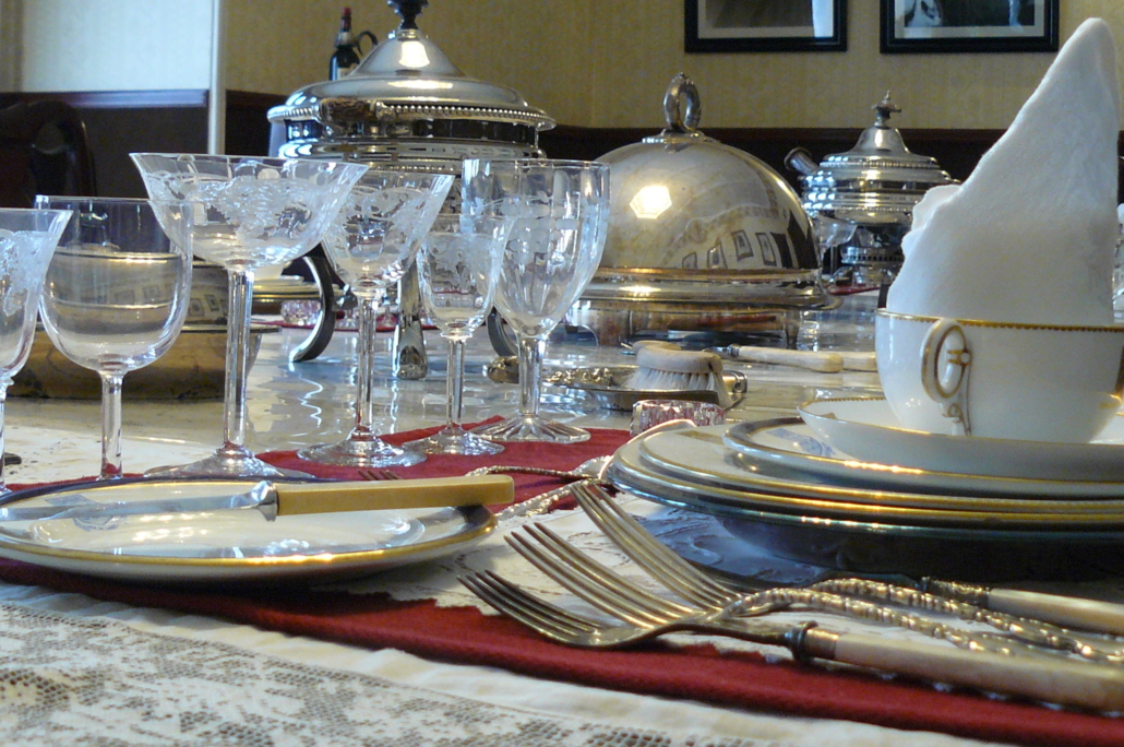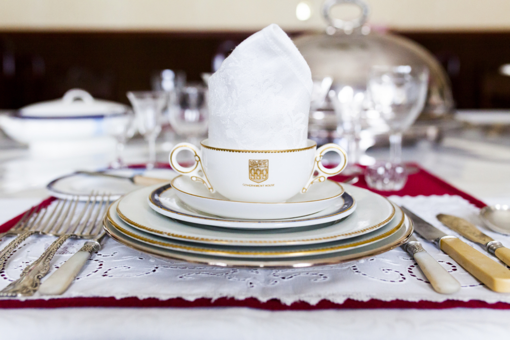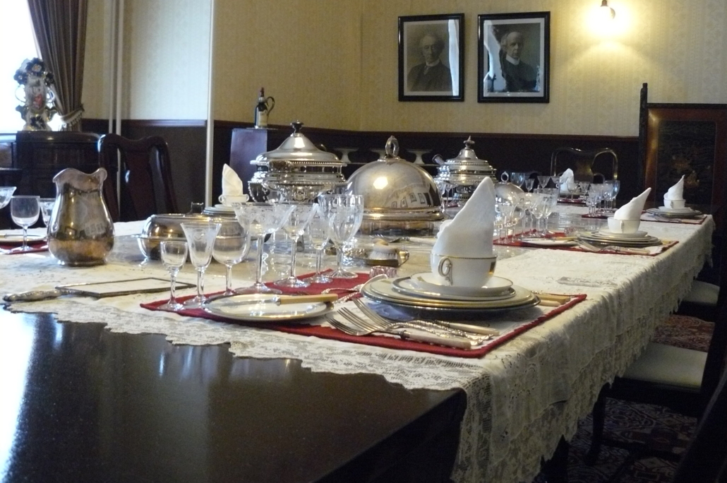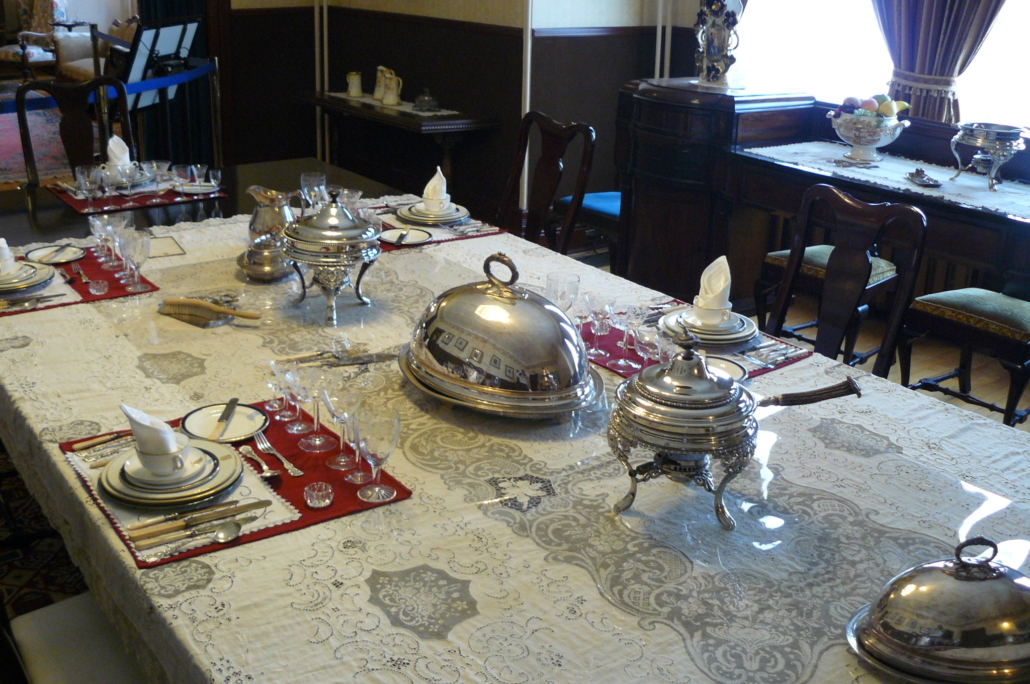Victorians were known for their indulgence and extravagance in everyday lives which included formal dinners. Dining at Government House included 7 to 10 courses of food, all richly prepared. Dinner was served “à la Russe” which meant that dishes were served by the servants and were kept on a side table, not placed on the dining table. The only dishes placed on the table were filled with olives, pickles, radishes, etc., as well as fruit and small pastries.