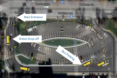 Government House is located at 4607 Dewdney Ave, just three blocks West of Lewvan Drive. Buses can drop their groups off at the sidewalk entrance in the Visitor Parking lot.